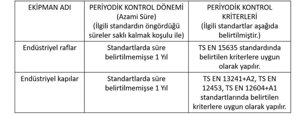 TS EN 15635 standardına göre, firma içi kontrollerin haftalık veya risk analiziyle belirlenecek periyotlarda, eğitimli bir personel (PRSES – Person Responsible for Storage Equipment Safety) tarafından yapılması zorunludur.